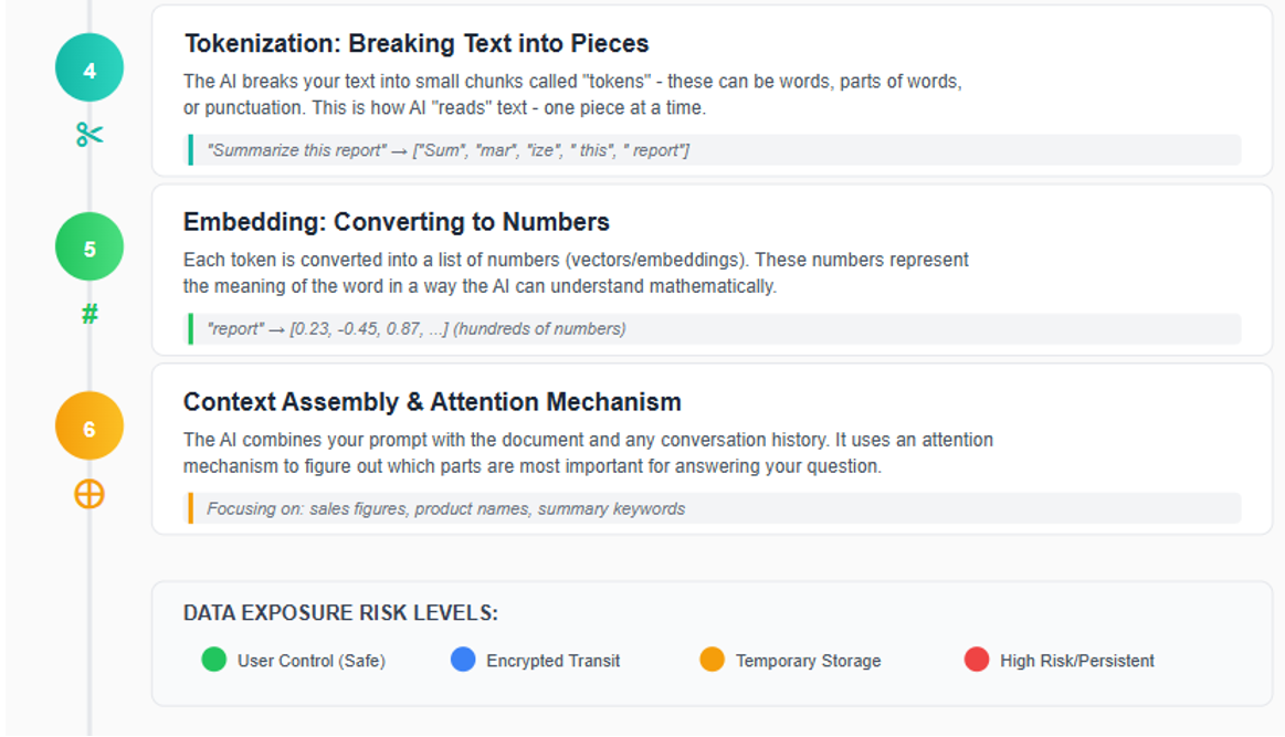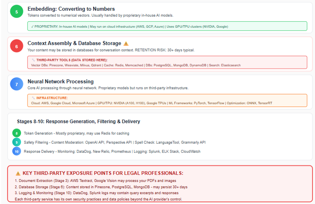 Stages 3 and 4 represent a critical exposure point for your client data. Your document is now stored on the AI provider's servers or on a third-party server with which the provider contracts.