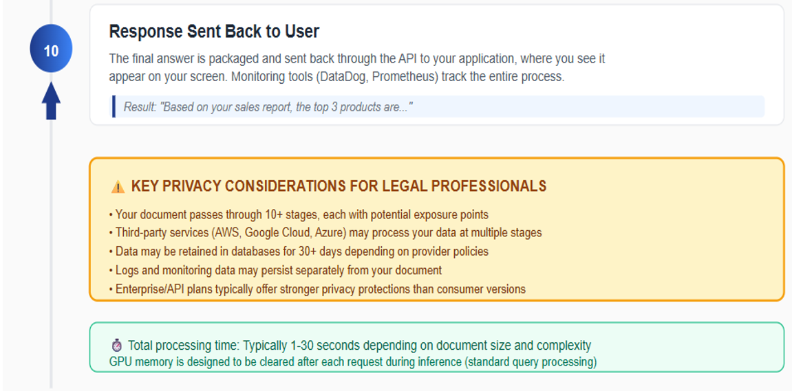 This article attempts to demystifies the AI query processing pipeline and explains where your client documents travel, identifies potential exposure points, and provides practical guidance for making informed decisions about AI tool usage. Visualizations accompany this article to help you understand these complex technical systems. References to the sources used to compile this information are provided.