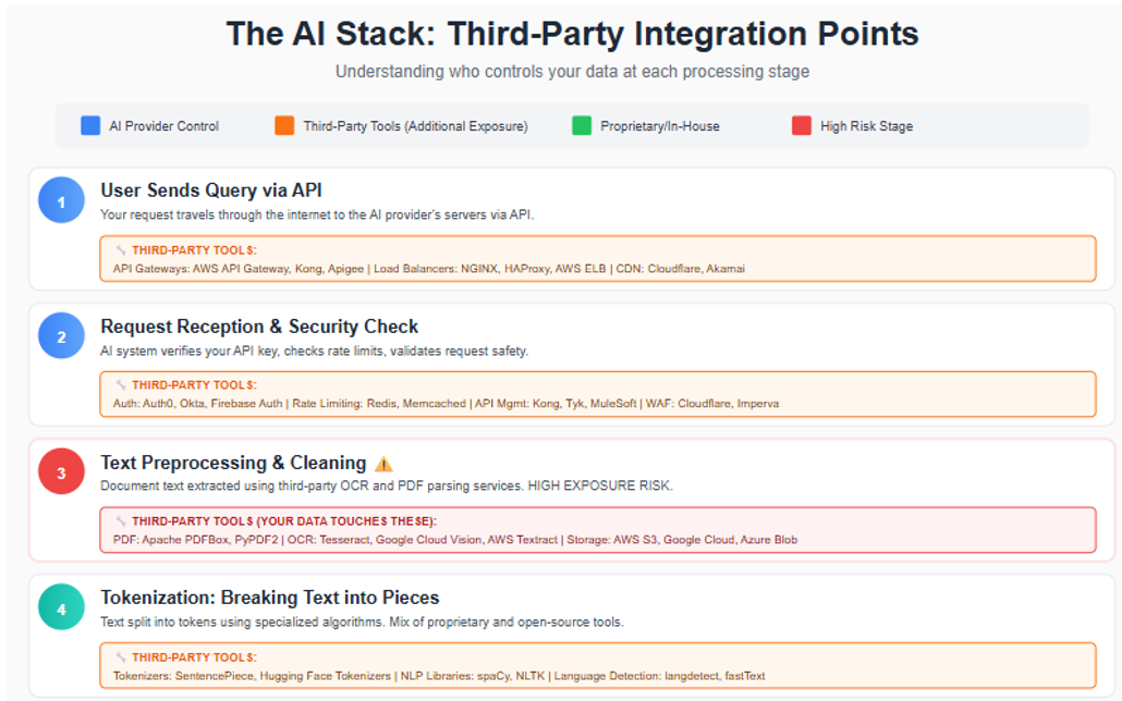 This creates additional exposure points. Your client document might be processed by AWS Textract for PDF text extraction or stored in databases hosted on Google Cloud. Each third-party service has its own security practices and data policies. [See Figure 3]