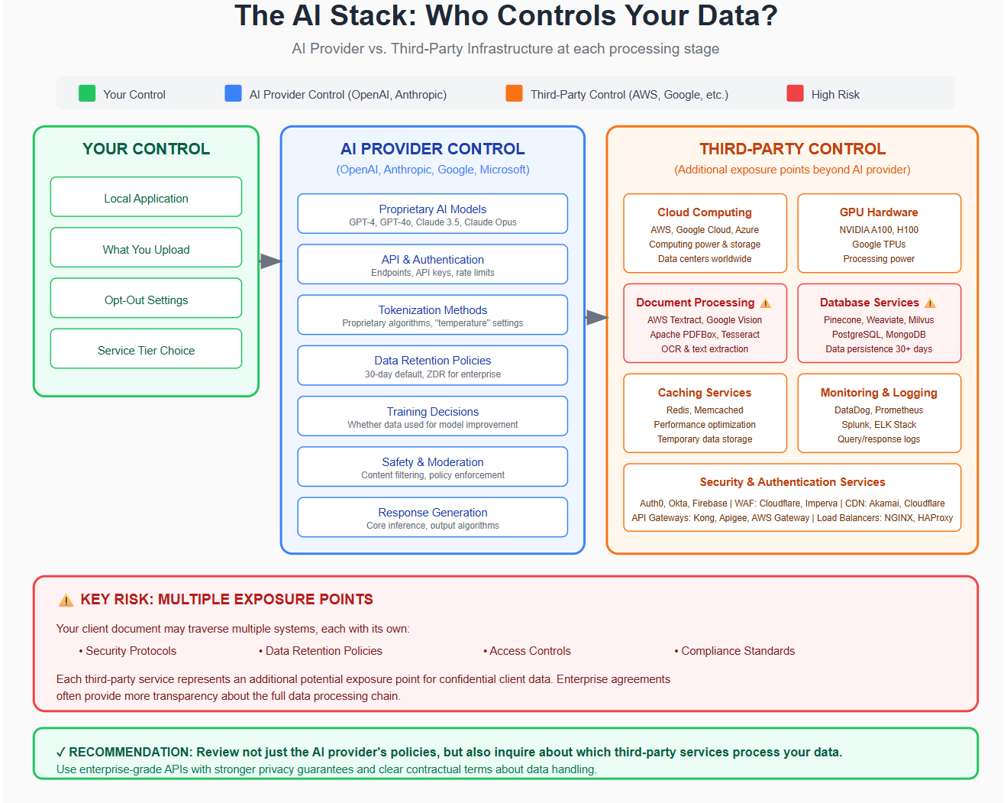 Once your document reaches the AI provider's infrastructure, it may be temporarily stored in memory (RAM), cache systems such as Redis or Memcached, or short-term disk storage. If you submit a PDF, Word document, or image, the provider typically relies on third-party services—like AWS Textract, Google Cloud Vision, or Apache PDFBox—to extract the text content. As a result, your client's confidential information can traverse additional systems operated by major cloud vendors, further expanding the circle of exposure beyond your direct control.